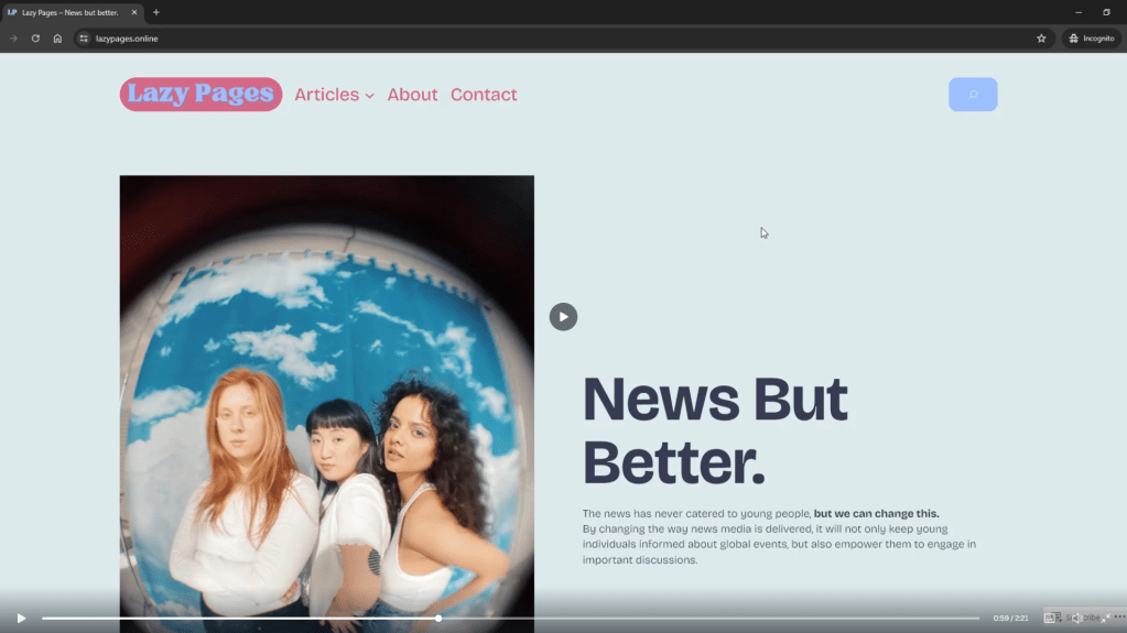 Using Plattner’s (2010) design thinking process during the project, I empathised with my audience’s need for visually appealing and easily digestible news content. However, upon reflection, I realised that the design of my website did not align with this vision. This led me to define the problem: the colour scheme and structure needed adjustment and my original plan to write full articles periodically was impractical given time constraints.