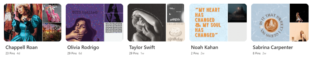 Inspired by something I used to do for fun many years ago, I began to create iPhone Wallpapers in Canva related to my favourite music artists and their lyrics (think Noah Kahan, Olivia Rodrigo and Taylor Swift). I posted these on my Pinterest page, along with curated content from other users, and left it for a few days. I then came back and checked my stats and realised that I had gained roughly 300 views. This was more than I’d ever received on my website and was extremely encouraging. In consultation with my network partners I began to think more strategically about conquering Pinterest’s algorithms which lead to some really great advice (such as: focus on a ‘niche’ and create conformity in your boards).